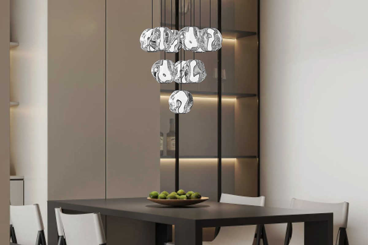 Inspired by the elegance of pearl, the opal-toned acrylic or glass globes cast soft illumination. Whether arrange into chandelier cluster or structural installations, it merges elegance with function.