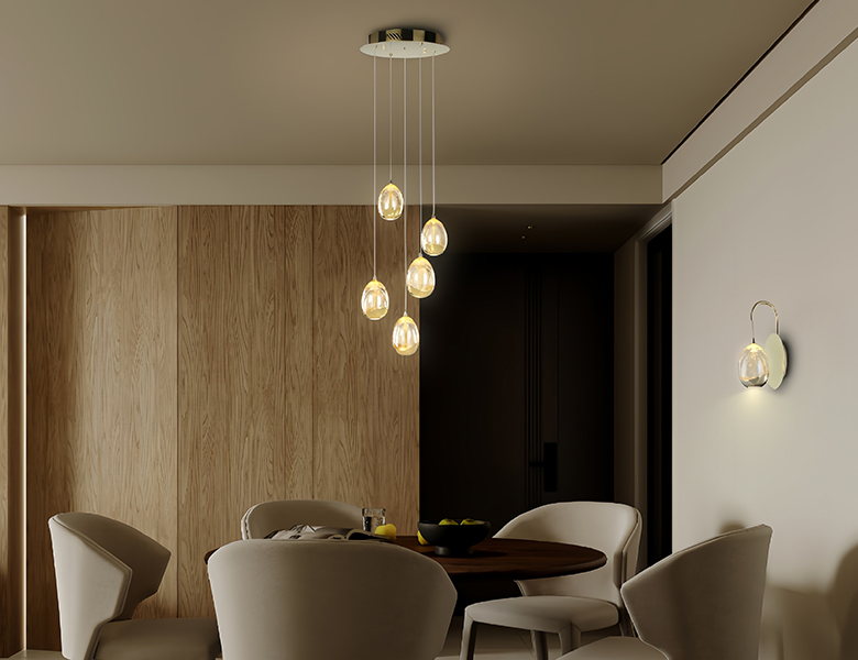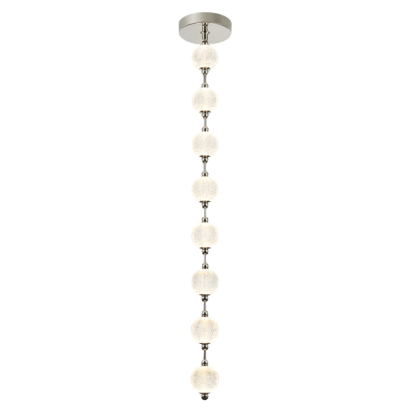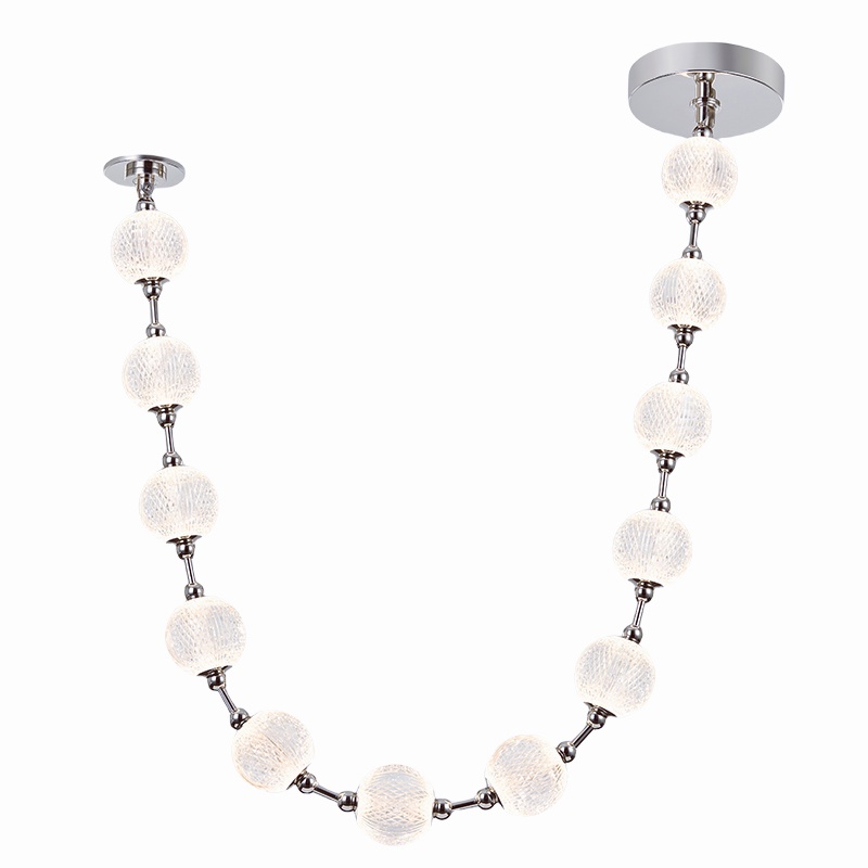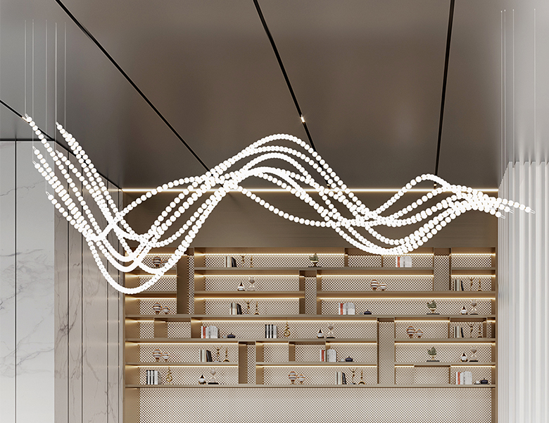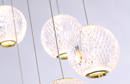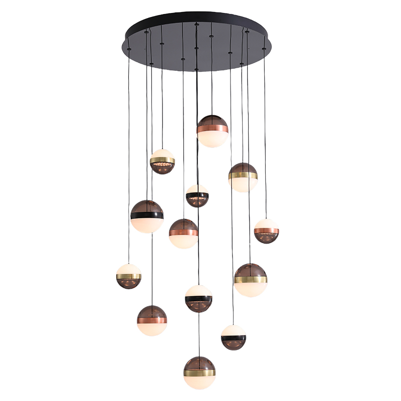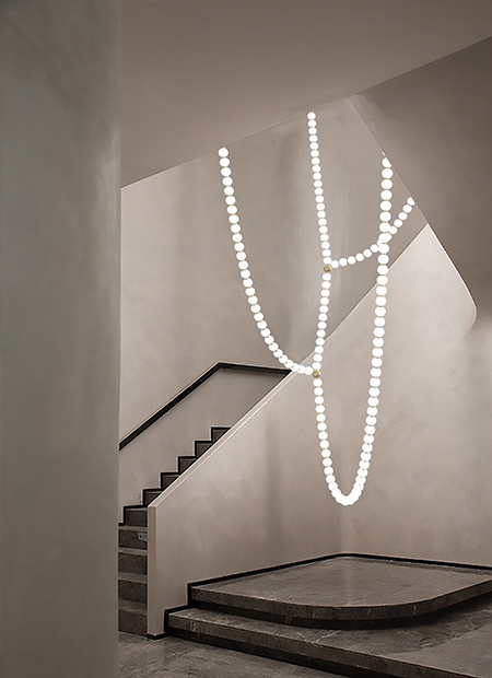 Inspired by the elegance of pearl, the opal-toned acrylic or glass globes cast soft illumination. Whether arrange into chandelier cluster or structural installations, it merges elegance with function.