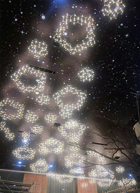 Inspired by delicate beauty of fireflies, the modular hexagonal system of Lucciola reimagines and transcend geometric limitations, offering endless possibilities in artistic spatial expression.