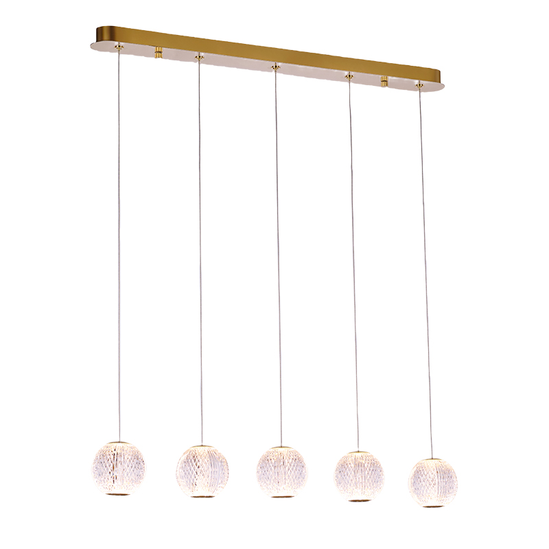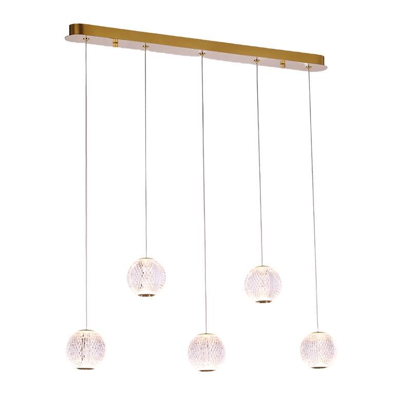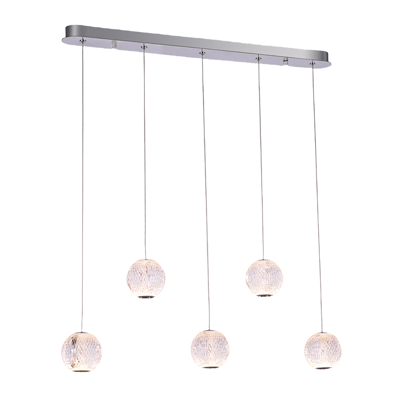 This 5-light round canopy pendant lamp shines like five suspended diamonds in the air. Each spherical lampshade features a crystal-clear body with finely cut textures that reflect light beautifully, creating a sparkling, diamond-like brilliance that brings a touch of luxury and romance to your space.