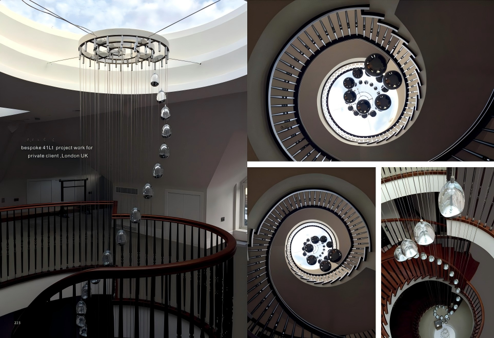 What makes this pendant unique is its adjustable suspension length. Each light can be customized to different heights, forming a cascading, dynamic arrangement, perfectly suited for specific stairways or architectural spaces. We also offer customized ceiling plates and light head quantities based on the space size and specific needs.